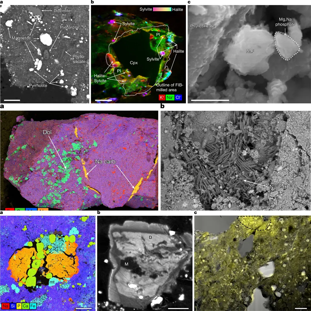 در نمونههای جمعآوریشده، غلظت بالایی از نمکهای سدیم (از جمله کربنات سدیم، سولفات سدیم، فسفات سدیم، سدیم فلوراید و سدیم کلرید ـ مطابق شکلهای ۱ تا ۳) شناسایی شده است. این کشف، یافتهای جدید محسوب میشود و وجود نمکهای سدیم مشابه پیشتر نیز در بخشهای مختلف منظومهٔ شمسی ـ مانند حلقههای زحل و فوارههای قمر انسلادوس ـ مشاهده شده است.
